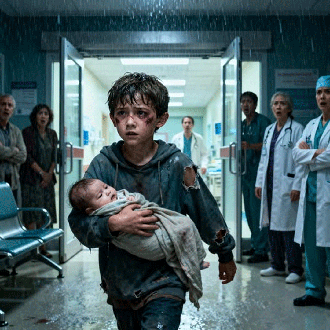 It was a boy, no more than seven years old, wearing an oversized, dirt-stained hoodie. His lip was split, his right eye swollen purple, and bruises dotted his skinny arms. In his trembling hands, he carried a bundled infant—his baby sister, wrapped only in a thin blanket despite the cold drizzle outside.