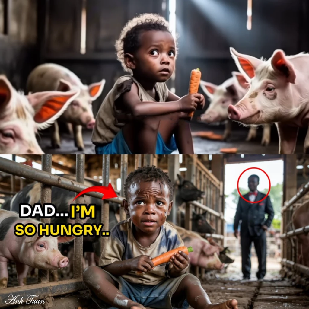 With trembling hands, Marcus reluctantly unlocked the chain. The door creaked open, revealing a sight that would haunt Alexander forever. There, in the filthy pen, sat his eight-year-old son. Gabriel was emaciated, his ribs visible beneath his torn shirt. His hair was matted with dirt, and his bare feet were covered in sores. In his tiny hands, he clutched half of a rotten carrot as if it were a precious treasure.
