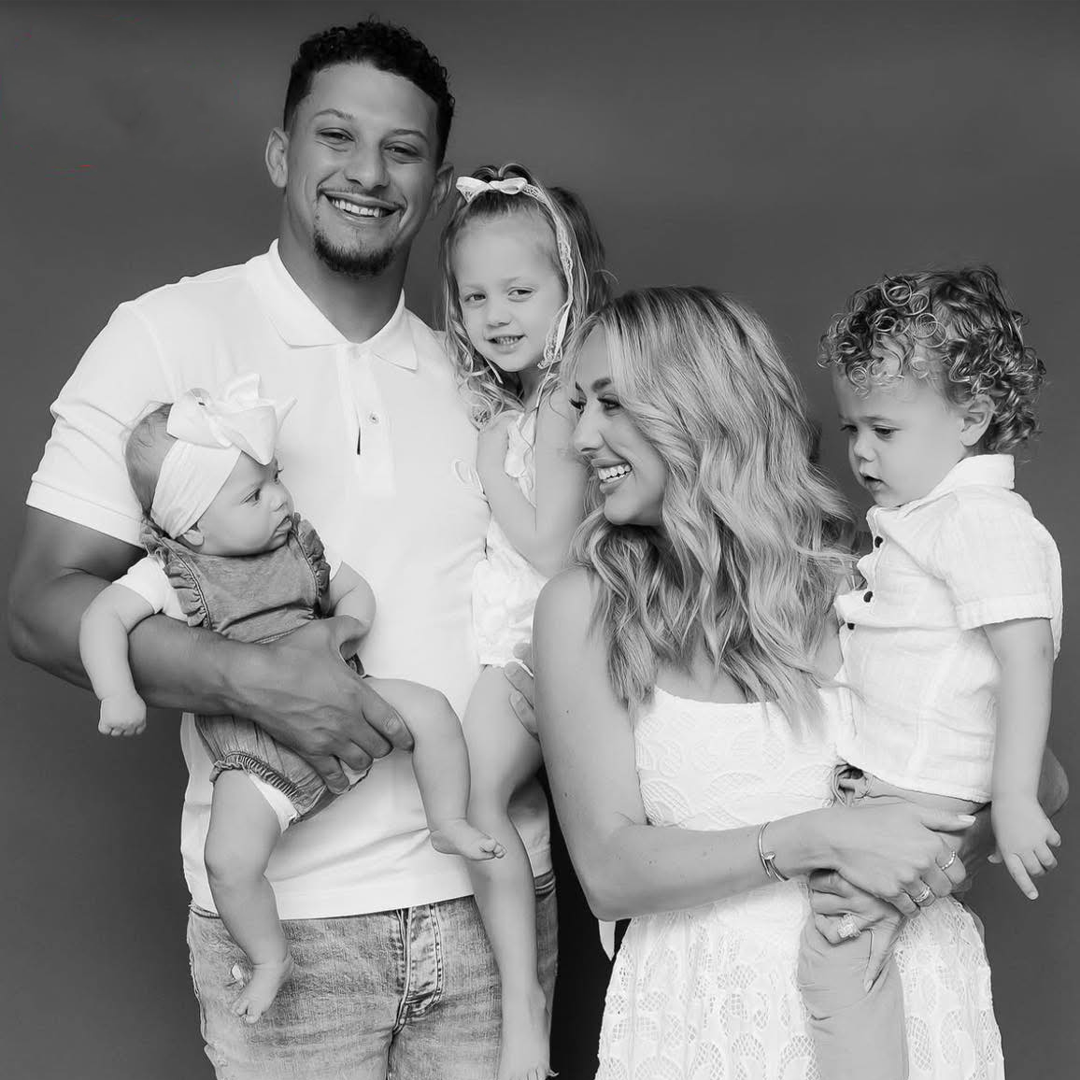 The photo was disarmingly intimate. Brittany, radiant in a soft cream dress, held baby Golden in her arms. Beside her, four-year-old Sterling Skye leaned confidently against her mom, almost mirroring her elegance. Two-year-old Patrick “Bronze” Lavon III clung playfully to Brittany’s side, his cheeky grin already echoing his father’s charm. And Patrick himself stood just behind them, in a casual button-up, not as the NFL’s most electrifying quarterback, but simply as a proud husband and dad.